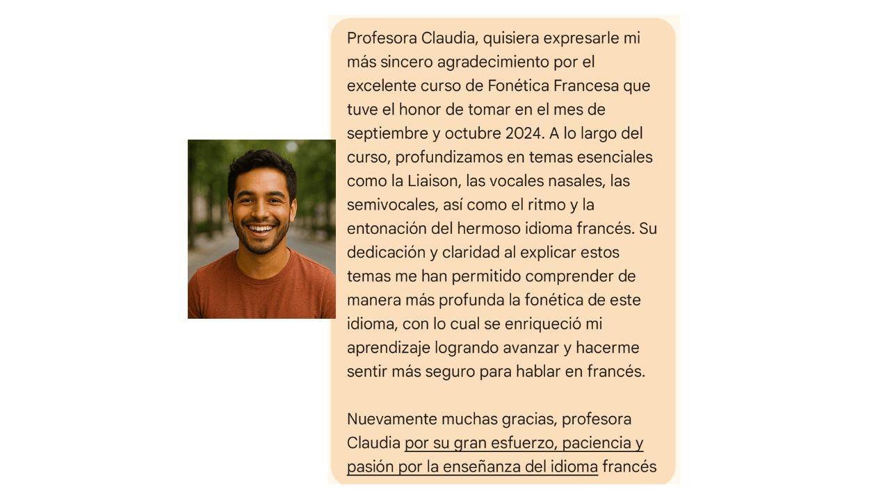 "Recomiendo este curso porque está muy bien estructurado y organizado. Las explicaciones son muy claras y concisas y muy buenas, creo que la pronunciación es indispensable en este idioma, Claudia me parece muy buena profesora, destaco también su formalidad, yo estudio francés para mejorar el curriculum y volvería a hacer otro curso con ella sin duda."